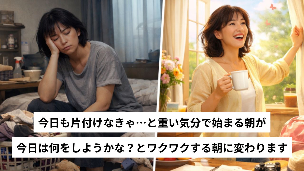 片付けられない悩みは、単に部屋が散らかるだけでなく、あなたから心穏やかに過ごすはずだった、二度と戻らない大切な瞬間を奪い続けているのです。